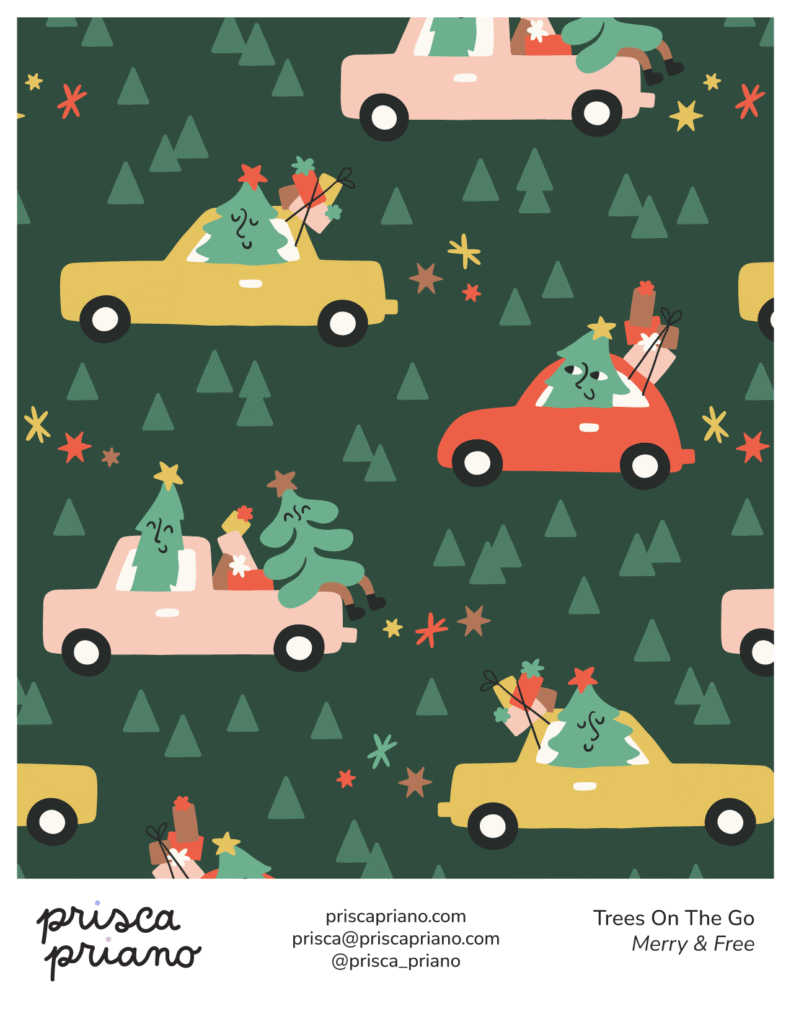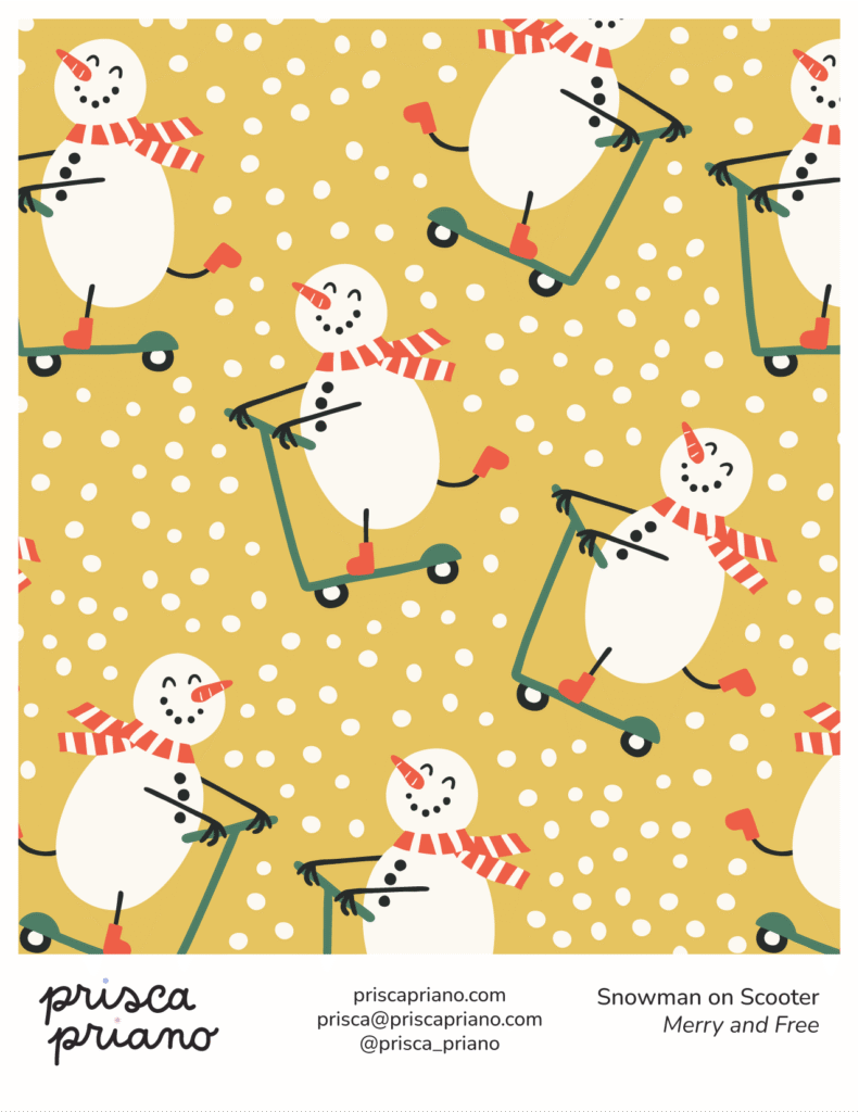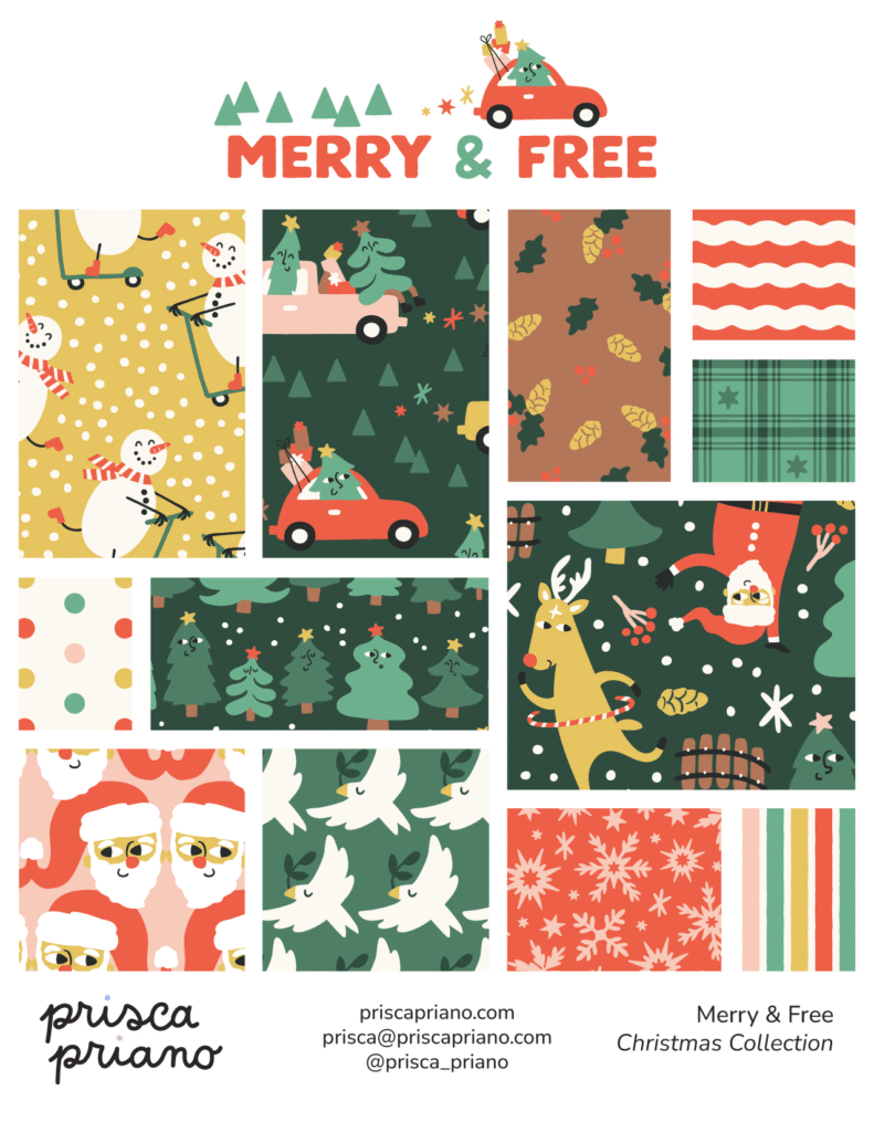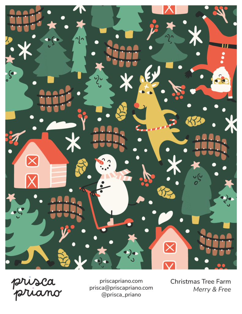 Merry & Free is a playful collection of modern Christmas pattern designs created especially for kids. From Santa doing handstands to a hula-hooping reindeer, a snowman on a scooter, and cheerful jumping trees — each print celebrates joy, movement, and freedom.